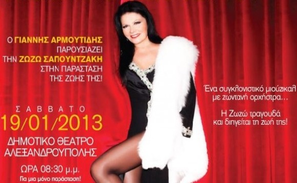 Ο Γιάννης Αρμουτίδης παρουσιάζει τη Ζωζώ Σαπουντζάκη στην παράσταση της ζωής της. Ένα συγκλονιστικό μιούζικαλ με ζωντανή ορχήστρα. Η Ζωζώ τραγουδά και διηγείται τη ζωή της.