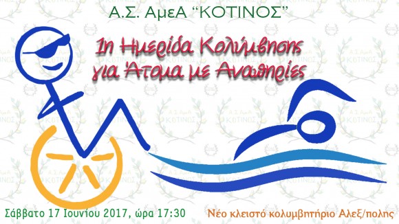 Δύο βδομάδες πριν από το πανελλήνιο Πρωτάθλημα Κολύμβησης ΑμεΑ στην Αθήνα, ο Α.Σ. ΑμεΑ «ΚΟΤΙΝΟΣ», με την υποστήριξη του Δήμου Αλεξανδρούπολης, διοργανώνει το Σάββατο 17 Ιουνίου 2017 (17:30), στο Νέο κλειστό κολυμβητήριο Αλεξανδρούπολης, την 1η Ημερίδα Κολύμβησης για Άτομα με Αναπηρίες.