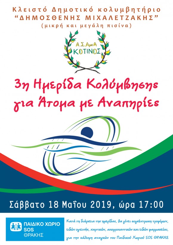Το Σάββατο 18 Μαΐου 2019 (17:00 με 19:00), θα διεξαχθεί στο Κλειστό Δημοτικό Κολυμβητήριο Αλεξανδρούπολης «ΔΗΜΟΣΘΕΝΗΣ ΜΙΧΑΛΕΤΖΑΚΗΣ», (μικρή και μεγάλη πισίνα), η 3η Κολυμβητική ημερίδα για Άτομα με Αναπηρίες «ΚΟΤΙΝΟΣ».