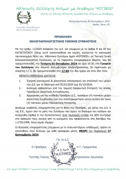 Συγκροτήθηκε σε Σώμα το νέο Δ.Σ. του Α.Σ. ΑμεΑ «ΚΟΤΙΝΟΣ», μετά από τα αποτελέσματα των αρχαιρεσιών που ολοκληρώθηκαν την Τετάρτη 02 Οκτωβρίου 2024. Η σύνθεση του νέου Δ.Σ. είναι: Πρόεδρος ο Γιάννης Τοπτσής, Αντιπρόεδρος η Ελισάβετ Ταχαή, Γραμματέας η Χρυσούλα Δημητροπούλου, Ταμίας ο Ειρήναρχος Κεμανετζής, Μέλος & Υπεύθυνη Δημοσίων Σχέσεων η Μαριλία Λογαρά και Αναπληρωματικό Μέλος & Υπεύθυνη προγραμμάτων συνεργασιών η Βασιλική Καλαμάρη. Στην Εξελεγκτική Επιτροπή [...]
