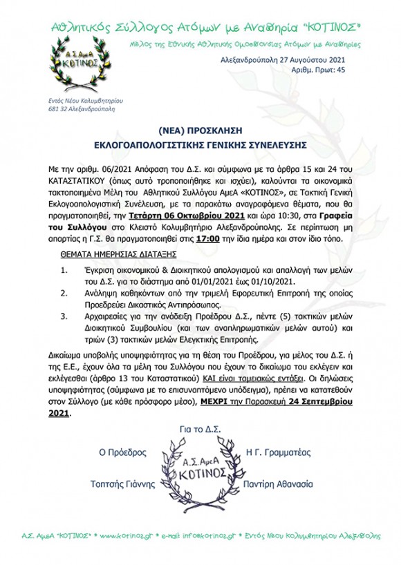 Με την αριθμ. 06/2021 Απόφαση του Δ.Σ. και σύμφωνα με τα άρθρα 15 και 24 του ΚΑΤΑΣΤΑΤΙΚΟΥ (όπως αυτό τροποποιήθηκε και ισχύει), καλούνται τα οικονομικά τακτοποιημένα Μέλη του Αθλητικού Συλλόγου ΑμεΑ «ΚΟΤΙΝΟΣ», σε Τακτική Γενική Εκλογοαπολογιστική Συνέλευση, με τα παρακάτω αναγραφόμενα θέματα, που θα πραγματοποιηθεί, την Τετάρτη 06 Οκτωβρίου 2021 και ώρα 10:30, στα Γραφεία του Συλλόγου στο Κλειστό Κολυμβητήριο Αλεξανδρούπολης. Σε περίπτωση μη απαρτίας η Γ.Σ. θα πραγματοποιηθεί στις 17:00 την ίδια ημέρα και στον ίδιο τόπο.