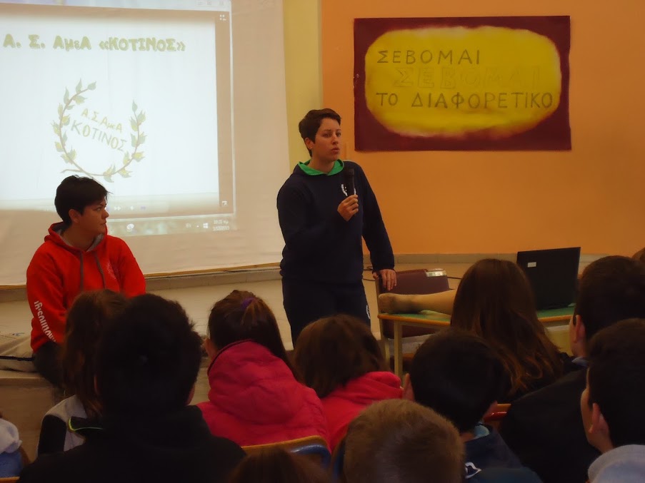 Σε ένα ζεστό χώρο από την παρουσία 311 μαθητών και μαθητριών που εντυπωσίασαν με τις γνώσεις τους για την αναπηρία, έγινε μία όμορφη παρουσίαση από την Χρυσούλα Δημητροπούλου, την Έλσα Ταχαή και την Δάφνη Δεληγιάννη που εκπροσώπησαν τον σύλλογό μας, τόσο για τις δραστηριότητες του «ΚΟΤΙΝΟΥ», όσο και γενικότερα για τις δυνατότητες και τους τρόπους άθλησης των Ατόμων με Αναπηρία.